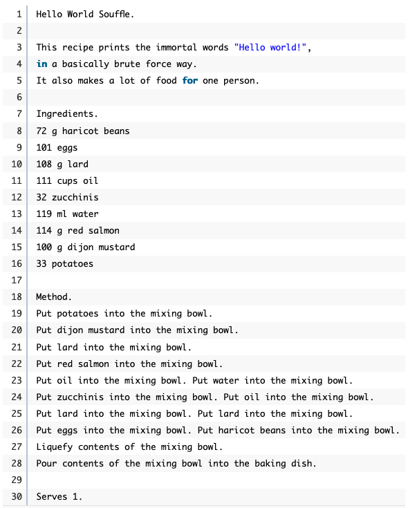 Chef, created by David Morgan-Mar, is a programming language that looks like a recipe. The extra twist in this coding language is that, in order for the code to be valid, the recipes have to work both as code AND as functional recipes that make for delicious meals for cooks with different tastes and budgets. Chef is the perfect language for coders looking for an extra scoop of challenge in their coding fun.