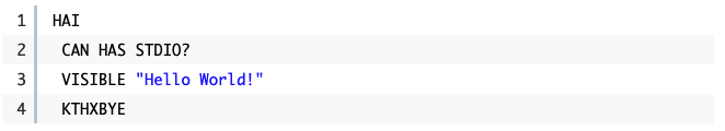 LOLCODE was created in 2007 by Adam Lindsay, researcher at Lancaster University. It’s a language comprised entirely of meme-ified “lolspeak”. It may not be the most functional coding language, but what LOLCODE lacks in usefulness, it more than makes up for in hilarity and cuteness. Take a look at the “Hello World!” code!