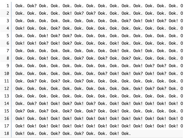 Ook! was created by serial esoteric language developer David Morgan-Mar, and it involves three words: "Ook.", "Ook?" and "Ook!". In developing Ook!, Morgan-Mar was attempting to create a programming language "writable and readable by orangutans". Yeah, we didn’t believe it when we heard it the first time either.