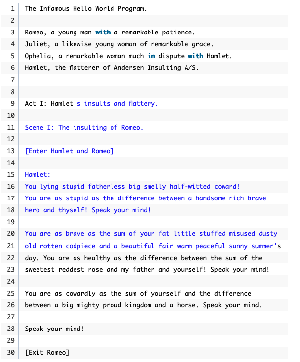 If you love a genteel Elizabethan romance, you’ll love the Shakespeare programming language. Created by Jon Aslund and Karl Hesselstörm, this language reads exactly like a Shakespeare play, including Shakespearean characters, titles, scenes, acts, and stage directions. Because this code is designed to read like a play, it’s quite lengthy — but here’s an excerpt of the “Hello World” code (full version is available here).